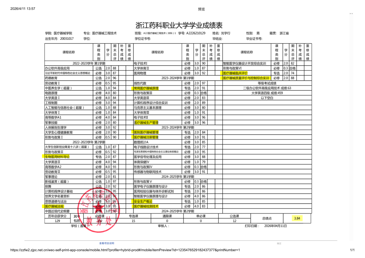 4.大学期间全是医疗器械相关的课程,获得过专业第一,对医疗器械生产、注册的全流程有全方位的了解,获得过省级检索大赛二等奖,参见过国赛,检索能力强